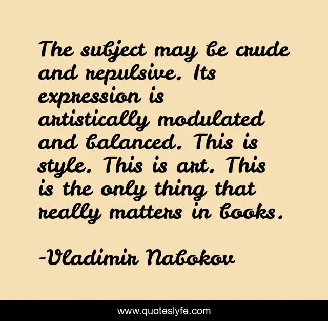 This page presents the quote "The subject may be crude and repulsive. Its expression is artistically modulated and balanced. This is style. This is art. This is the only thing that really matters in books.". Author of this quote is Vladimir Nabokov. This quote is about style, art, writing,.
