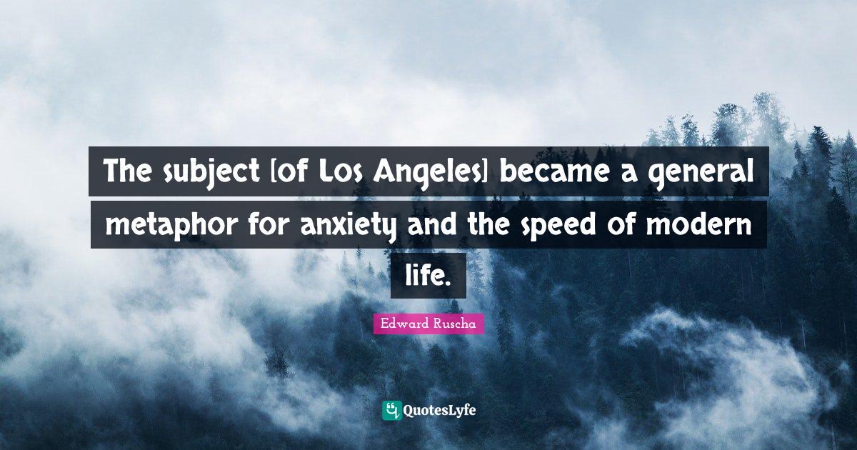 This page presents the quote "The subject [of Los Angeles] became a general metaphor for anxiety and the speed of modern life.". Author of this quote is Edward Ruscha. This quote is about anxiety, speed, los angeles, modern life, metaphor,.