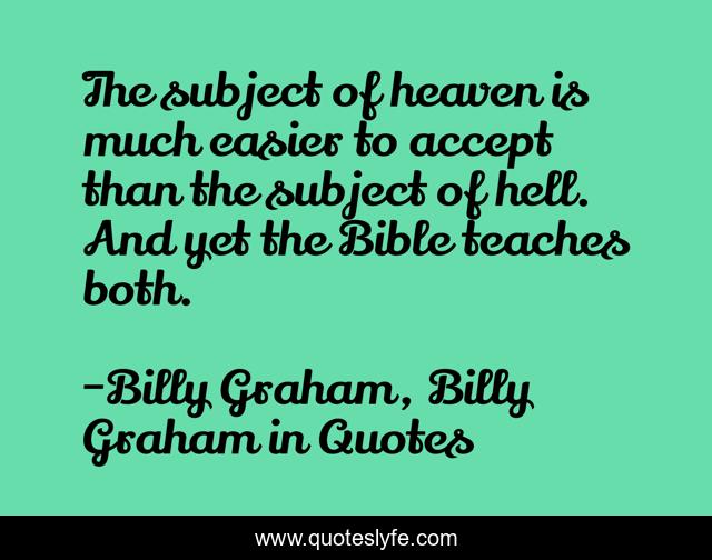 This page presents the quote "The subject of heaven is much easier to accept than the subject of hell. And yet the Bible teaches both.". Author of this quote is Billy Graham, Billy Graham in Quotes. This quote is about hell, billy-graham,.