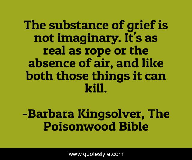 This page presents the quote "The substance of grief is not imaginary. It's as real as rope or the absence of air, and like both those things it can kill.". Author of this quote is Barbara Kingsolver, The Poisonwood Bible. .