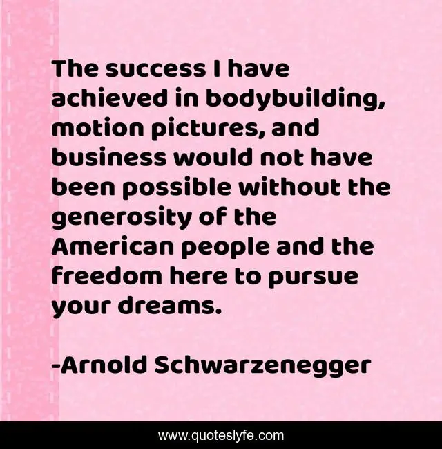 This page presents the quote "The success I have achieved in bodybuilding, motion pictures, and business would not have been possible without the generosity of the American people and the freedom here to pursue your dreams.". Author of this quote is Arnold Schwarzenegger. This quote is about freedom, success, dreams,.