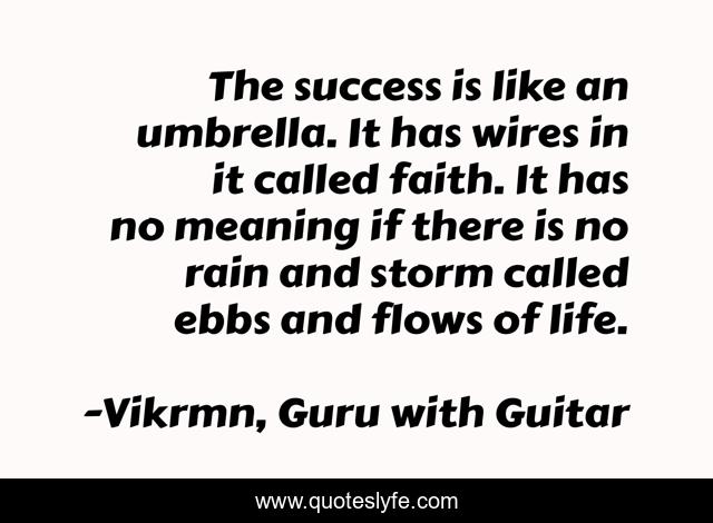 This page presents the quote "The success is like an umbrella. It has wires in it called faith. It has no meaning if there is no rain and storm called ebbs and flows of life.". Author of this quote is Vikrmn, Guru with Guitar. This quote is about faith, gwg, umbrella, success, positive, motivational, confidence, ca-vikram-verma, guru-with-guitar,.