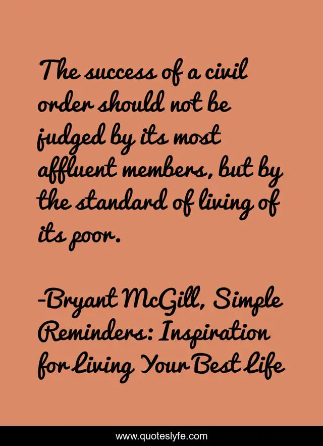 This page presents the quote "The success of a civil order should not be judged by its most affluent members, but by the standard of living of its poor.". Author of this quote is Bryant McGill, Simple Reminders: Inspiration for Living Your Best Life. This quote is about judgement, living, poverty, success,.