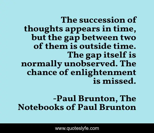 This page presents the quote "The succession of thoughts appears in time, but the gap between two of them is outside time. The gap itself is normally unobserved. The chance of enlightenment is missed.". Author of this quote is Paul Brunton, The Notebooks of Paul Brunton. This quote is about thought, meditation,.
