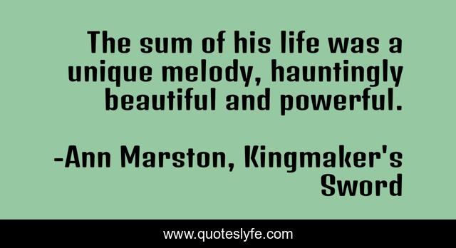 This page presents the quote "The sum of his life was a unique melody, hauntingly beautiful and powerful.". Author of this quote is Ann Marston, Kingmaker's Sword. This quote is about life, death,.