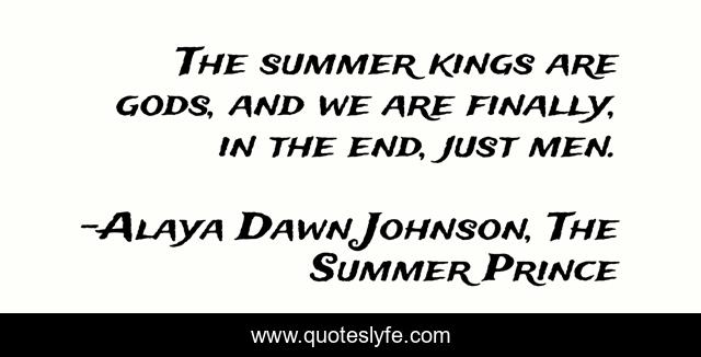 This page presents the quote "The summer kings are gods, and we are finally, in the end, just men.". Author of this quote is Alaya Dawn Johnson, The Summer Prince. This quote is about gods, death, enki, gods-and-men, men,.