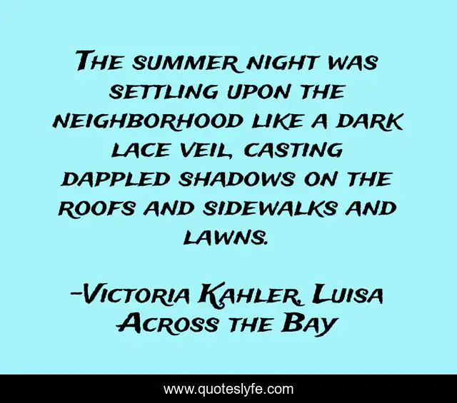 This page presents the quote "The summer night was settling upon the neighborhood like a dark lace veil, casting dappled shadows on the roofs and sidewalks and lawns.". Author of this quote is Victoria Kahler, Luisa Across the Bay. This quote is about shadows, summer-nights, neighborhoods, summer, suburbs, night,.