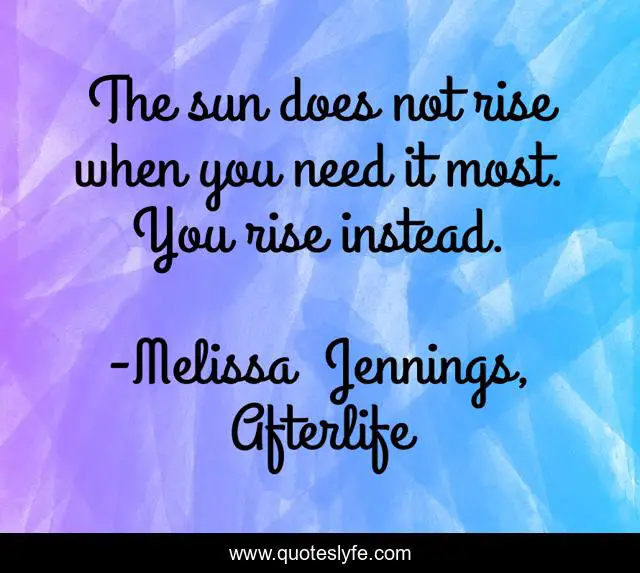 This page presents the quote "The sun does not rise when you need it most. You rise instead.". Author of this quote is Melissa Jennings, Afterlife. This quote is about life, afterlife, conquer, inspirational, enthusiasm, determination,.