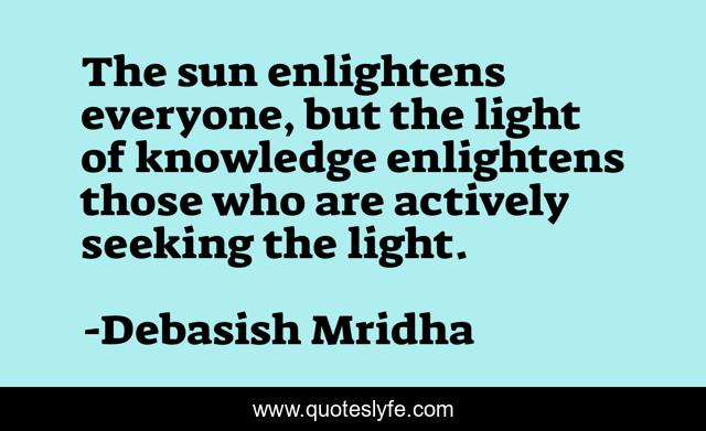 This page presents the quote "The sun enlightens everyone, but the light of knowledge enlightens those who are actively seeking the light.". Author of this quote is Debasish Mridha. This quote is about knowledge, philosophy, debasish-mridha, light-of-knowledge, quotes, inspirational, enthusiasm, sun-enlightens-everyone, debasish-mridha-m-d,.
