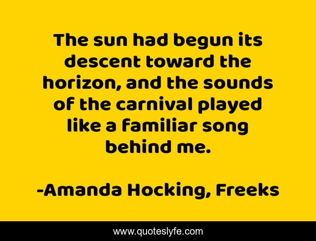 This page presents the quote "The sun had begun its descent toward the horizon, and the sounds of the carnival played like a familiar song behind me.". Author of this quote is Amanda Hocking, Freeks. This quote is about young-adult, paranormal, carnival,.