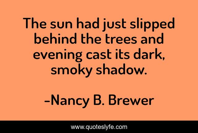 This page presents the quote "The sun had just slipped behind the trees and evening cast its dark, smoky shadow.". Author of this quote is Nancy B. Brewer. This quote is about historical-fiction, historical-romance,.