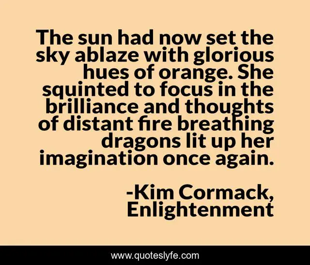 This page presents the quote "The sun had now set the sky ablaze with glorious hues of orange. She squinted to focus in the brilliance and thoughts of distant fire breathing dragons lit up her imagination once again.". Author of this quote is Kim Cormack, Enlightenment. This quote is about love, beauty, afterlife, immortals, immortality, affection,.