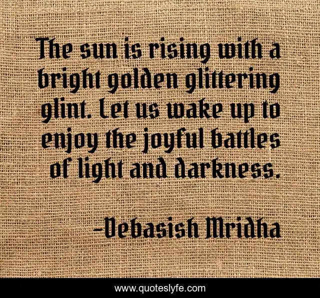 This page presents the quote "The sun is rising with a bright golden glittering glint. Let us wake up to enjoy the joyful battles of light and darkness.". Author of this quote is Debasish Mridha. This quote is about joyful-battles, wake-up-to-enjoy-the-day, sun-is-rising, debasish-mridha, quotes, debasish-mridha-md, inspirational, enthusiasm, battles-of-light-and-darkness,.