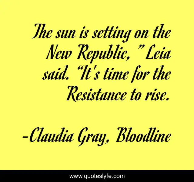This page presents the quote "The sun is setting on the New Republic, ” Leia said. “It's time for the Resistance to rise.". Author of this quote is Claudia Gray, Bloodline. This quote is about star-wars, leia-organa, resistance, new-republic, sun,.