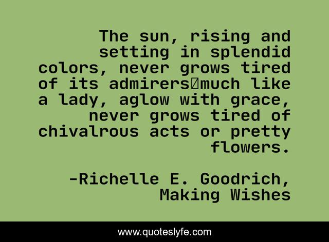 This page presents the quote "The sun, rising and setting in splendid colors, never grows tired of its admirers―much like a lady, aglow with grace, never grows tired of chivalrous acts or pretty flowers.". Author of this quote is Richelle E. Goodrich, Making Wishes. This quote is about chivalry, gallantry, chivalrous, courtesy, sunset, flowers, grace, sunrise,.