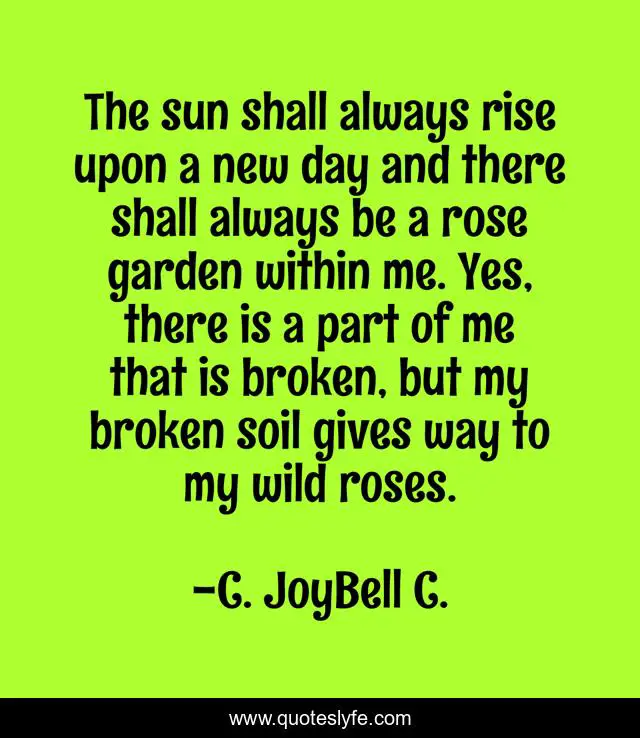 This page presents the quote "The sun shall always rise upon a new day and there shall always be a rose garden within me. Yes, there is a part of me that is broken, but my broken soil gives way to my wild roses.". Author of this quote is C. JoyBell C.. This quote is about invincibility, inner-strength, wild-roses, healing, inspirational, inspirational-life, enthusiasm, believe, hope,.