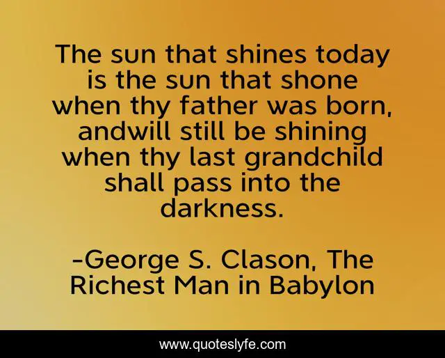 This page presents the quote "The sun that shines today is the sun that shone when thy father was born, andwill still be shining when thy last grandchild shall pass into the darkness.". Author of this quote is George S. Clason, The Richest Man in Babylon. This quote is about babylon, clason, sun,.