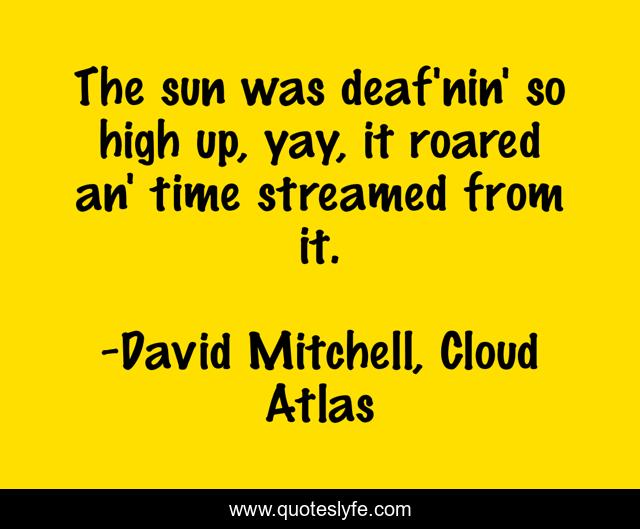 This page presents the quote "The sun was deaf'nin' so high up, yay, it roared an' time streamed from it.". Author of this quote is David Mitchell, Cloud Atlas. This quote is about sun, description,.