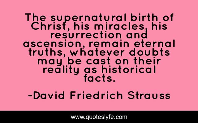 This page presents the quote "The supernatural birth of Christ, his miracles, his resurrection and ascension, remain eternal truths, whatever doubts may be cast on their reality as historical facts.". Author of this quote is David Friedrich Strauss. This quote is about facts, birth, reality,.