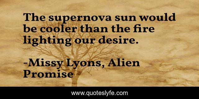This page presents the quote "The supernova sun would be cooler than the fire lighting our desire.". Author of this quote is Missy Lyons, Alien Promise. This quote is about desire, love, sun, heat, lust, hot, affection,.