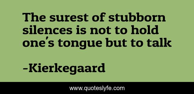This page presents the quote "The surest of stubborn silences is not to hold one's tongue but to talk". Author of this quote is Kierkegaard. This quote is about existentialism, philosophy, inspirational, enthusiasm,.
