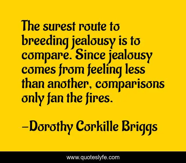This page presents the quote "The surest route to breeding jealousy is to compare. Since jealousy comes from feeling less than another, comparisons only fan the fires.". Author of this quote is Dorothy Corkille Briggs. This quote is about compare, feeling, fan,.