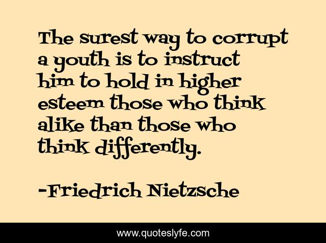This page presents the quote "The surest way to corrupt a youth is to instruct him to hold in higher esteem those who think alike than those who think differently.". Author of this quote is Friedrich Nietzsche. This quote is about youth, individuality, corruption, peer-pressure,.