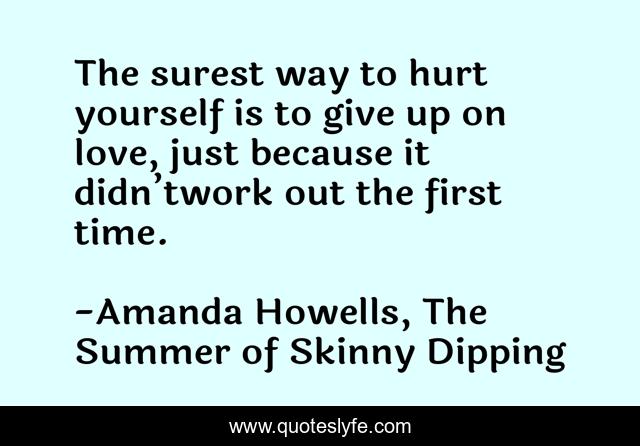 This page presents the quote "The surest way to hurt yourself is to give up on love, just because it didn’twork out the first time.". Author of this quote is Amanda Howells, The Summer of Skinny Dipping. This quote is about love, quitting, affection, hurt,.