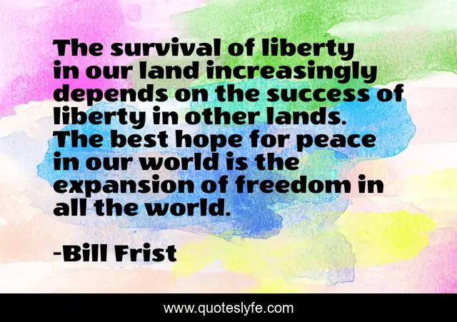 This page presents the quote "The survival of liberty in our land increasingly depends on the success of liberty in other lands. The best hope for peace in our world is the expansion of freedom in all the world.". Author of this quote is Bill Frist. This quote is about freedom, peace, success,.