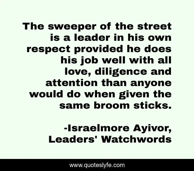 This page presents the quote "The sweeper of the street is a leader in his own respect provided he does his job well with all love, diligence and attention than anyone would do when given the same broom sticks.". Author of this quote is Israelmore Ayivor, Leaders' Watchwords. This quote is about cleaner, love, leaders, streets, sweep, street, respect, food-for-thought, lead,.