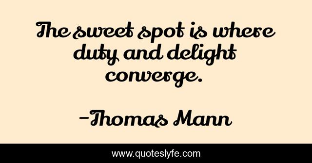 This page presents the quote "The sweet spot is where duty and delight converge.". Author of this quote is Thomas Mann. This quote is about discipleship, obedience, affection,.