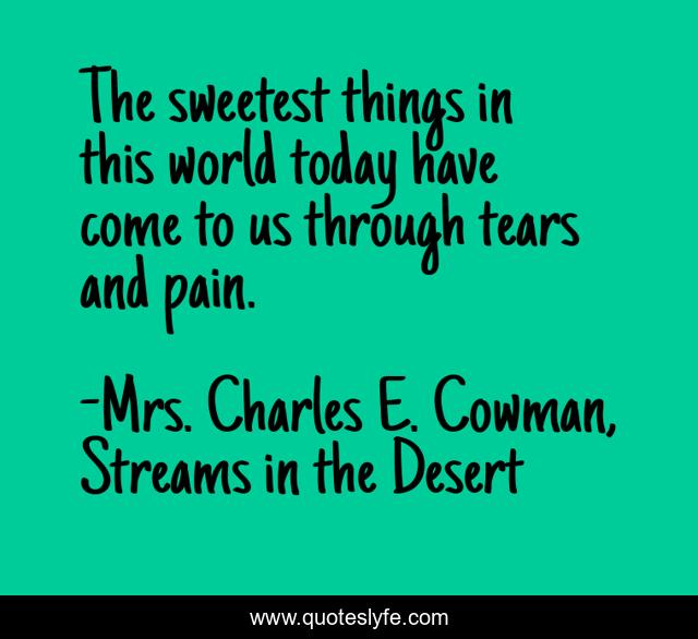 This page presents the quote "The sweetest things in this world today have come to us through tears and pain.". Author of this quote is Mrs. Charles E. Cowman, Streams in the Desert. This quote is about tears, pain, hope,.