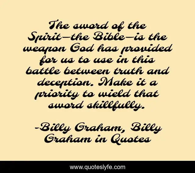 This page presents the quote "The sword of the Spirit—the Bible—is the weapon God has provided for us to use in this battle between truth and deception. Make it a priority to wield that sword skillfully.". Author of this quote is Billy Graham, Billy Graham in Quotes. This quote is about bible, billy-graham,.