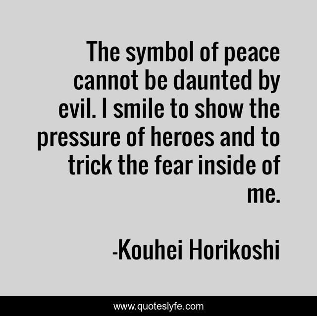 This page presents the quote "The symbol of peace cannot be daunted by evil. I smile to show the pressure of heroes and to trick the fear inside of me.". Author of this quote is Kouhei Horikoshi. This quote is about positive, confidence, motivational, hero, optimistic,.