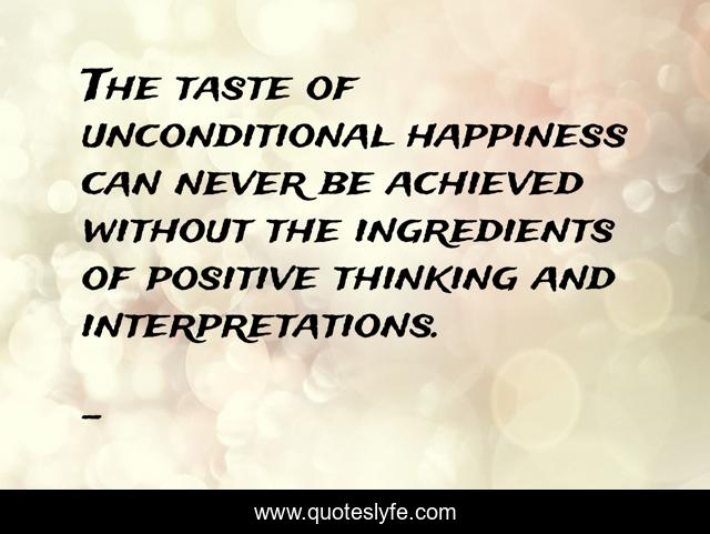 This page presents the quote "The taste of unconditional happiness can never be achieved without the ingredients of positive thinking and interpretations.". Author of this quote is . This quote is about being-happy-in-life, edmond-mbiaka, positive-interpretations, unconditional-happiness, positive-thinking,.