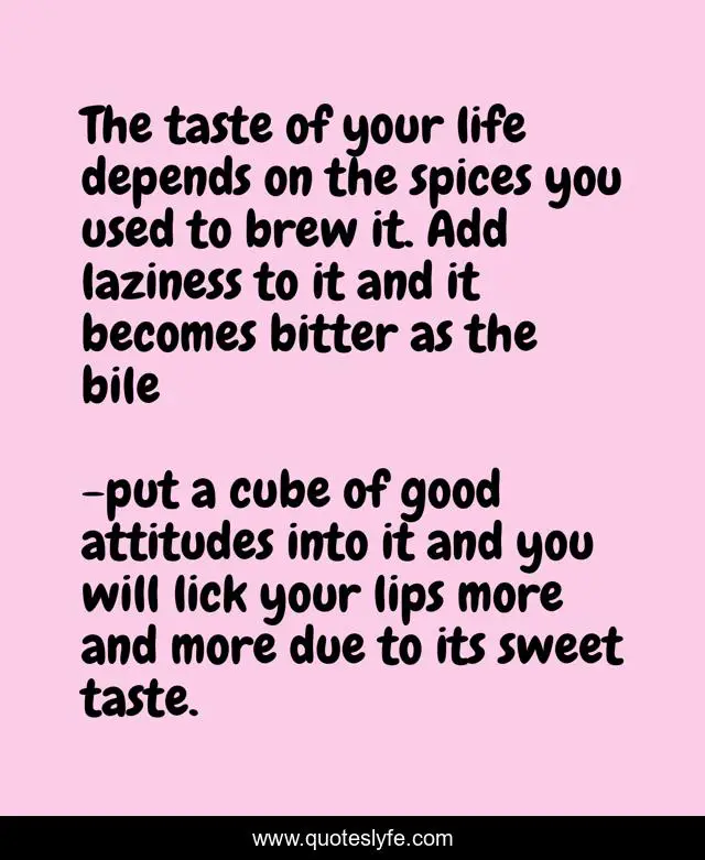 "put a cube of good attitudes into it and you will lick your lips more and more due to its sweet taste. Quotes." Quoteslyfe.com, 2025. Mon. 08 Dec. 2025. <https://www.quoteslyfe.com/quote/The-taste-of-your-life-depends-on-179691>.