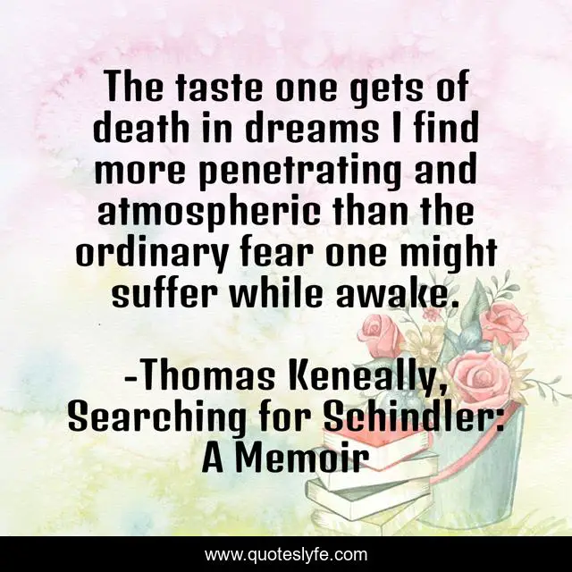 This page presents the quote "The taste one gets of death in dreams I find more penetrating and atmospheric than the ordinary fear one might suffer while awake.". Author of this quote is Thomas Keneally, Searching for Schindler: A Memoir. This quote is about death, dreams,.