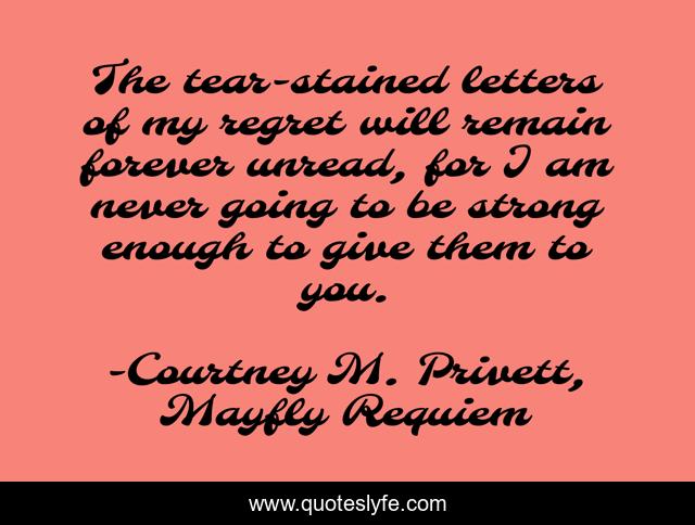 This page presents the quote "The tear-stained letters of my regret will remain forever unread, for I am never going to be strong enough to give them to you.". Author of this quote is Courtney M. Privett, Mayfly Requiem. This quote is about strength, letters, regret, regrets,.