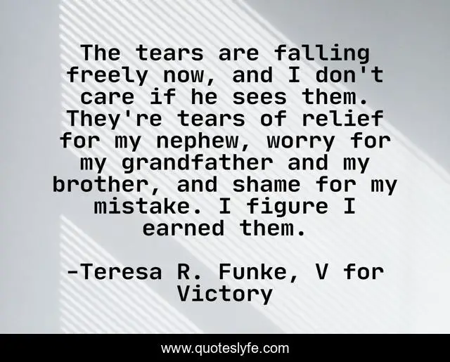 This page presents the quote "The tears are falling freely now, and I don't care if he sees them. They're tears of relief for my nephew, worry for my grandfather and my brother, and shame for my mistake. I figure I earned them.". Author of this quote is Teresa R. Funke, V for Victory. This quote is about world-war-ii, war, tears, courage, crying, children, inspiration,.