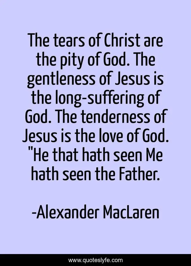 This page presents the quote "The tears of Christ are the pity of God. The gentleness of Jesus is the long-suffering of God. The tenderness of Jesus is the love of God. "He that hath seen Me hath seen the Father.". Author of this quote is Alexander MacLaren. This quote is about god, mercy,.
