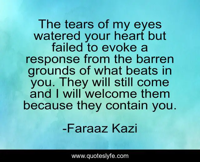 This page presents the quote "The tears of my eyes watered your heart but failed to evoke a response from the barren grounds of what beats in you. They will still come and I will welcome them because they contain you.". Author of this quote is Faraaz Kazi. This quote is about true-love, pain, tragic, sad,.