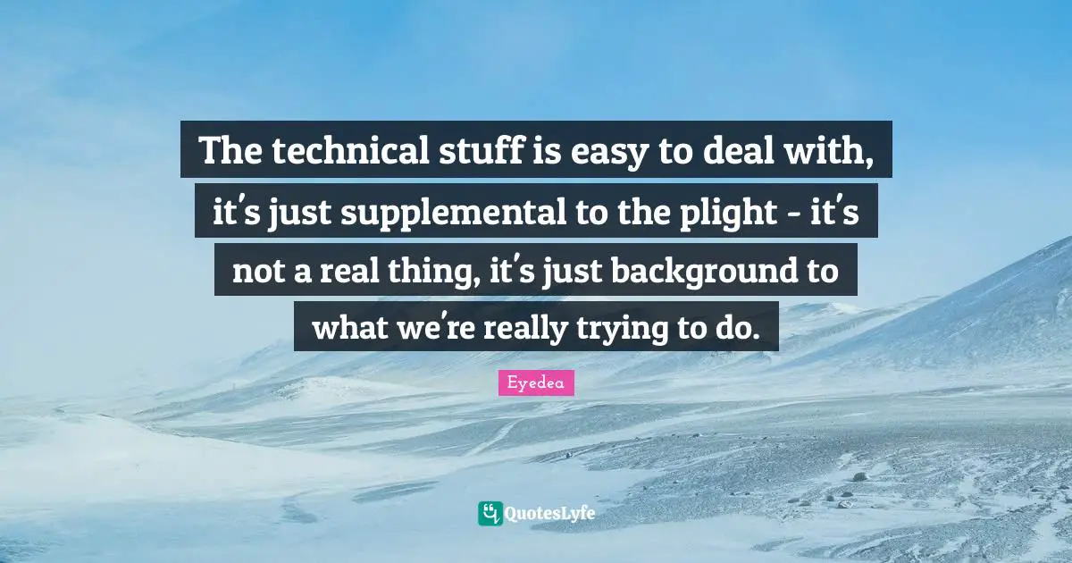 This page presents the quote "The technical stuff is easy to deal with, it's just supplemental to the plight - it's not a real thing, it's just background to what we're really trying to do.". Author of this quote is Eyedea. This quote is about easy, trying, real, plight, stuff,.