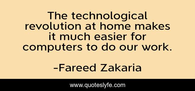 This page presents the quote "The technological revolution at home makes it much easier for computers to do our work.". Author of this quote is Fareed Zakaria. This quote is about home, work, revolution,.
