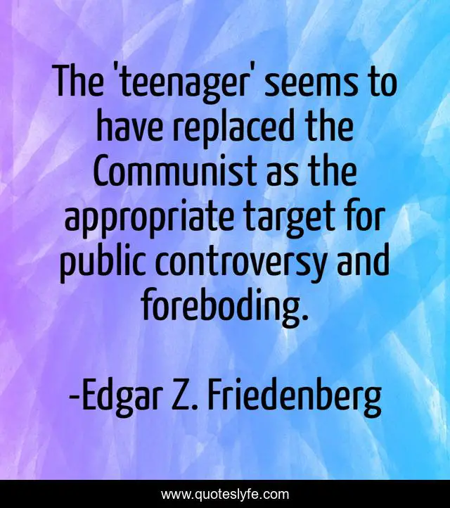 This page presents the quote "The 'teenager' seems to have replaced the Communist as the appropriate target for public controversy and foreboding.". Author of this quote is Edgar Z. Friedenberg. .