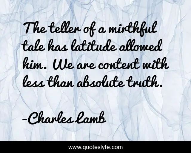 This page presents the quote "The teller of a mirthful tale has latitude allowed him. We are content with less than absolute truth.". Author of this quote is Charles Lamb. This quote is about humorists, humour,.