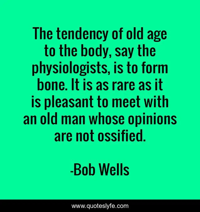 This page presents the quote "The tendency of old age to the body, say the physiologists, is to form bone. It is as rare as it is pleasant to meet with an old man whose opinions are not ossified.". Author of this quote is Bob Wells. This quote is about opinions, old age, man,.