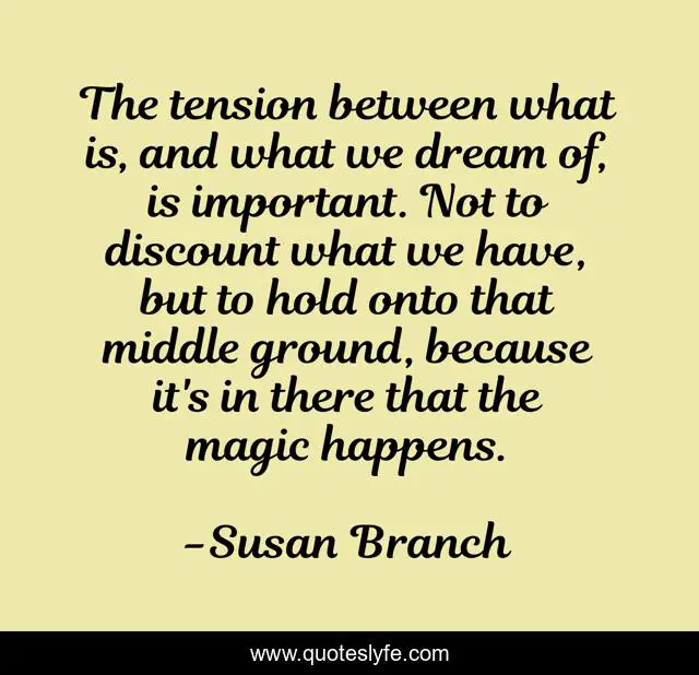 This page presents the quote "The tension between what is, and what we dream of, is important. Not to discount what we have, but to hold onto that middle ground, because it's in there that the magic happens.". Author of this quote is Susan Branch. This quote is about magic, dreams, inspiration,.
