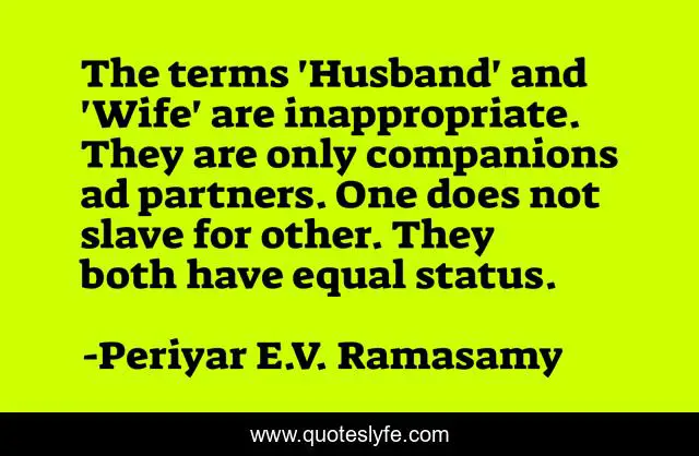 This page presents the quote "The terms 'Husband' and 'Wife' are inappropriate. They are only companions ad partners. One does not slave for other. They both have equal status.". Author of this quote is Periyar E.V. Ramasamy. This quote is about equality, marriage,.