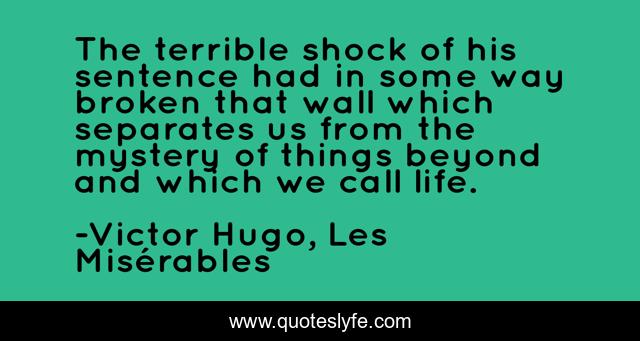 This page presents the quote "The terrible shock of his sentence had in some way broken that wall which separates us from the mystery of things beyond and which we call life.". Author of this quote is Victor Hugo, Les Misérables. This quote is about wall, broken,.