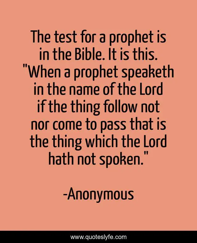This page presents the quote "The test for a prophet is in the Bible. It is this. "When a prophet speaketh in the name of the Lord if the thing follow not nor come to pass that is the thing which the Lord hath not spoken."". Author of this quote is Anonymous. .